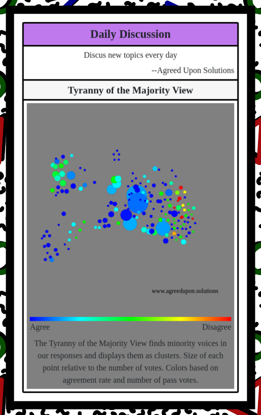 The Tyranny of the Majority View finds minority voices in our responses and displays them as clusters. Size of each point relative to the number of votes. Colors based on agreement rate and number of pass votes.
