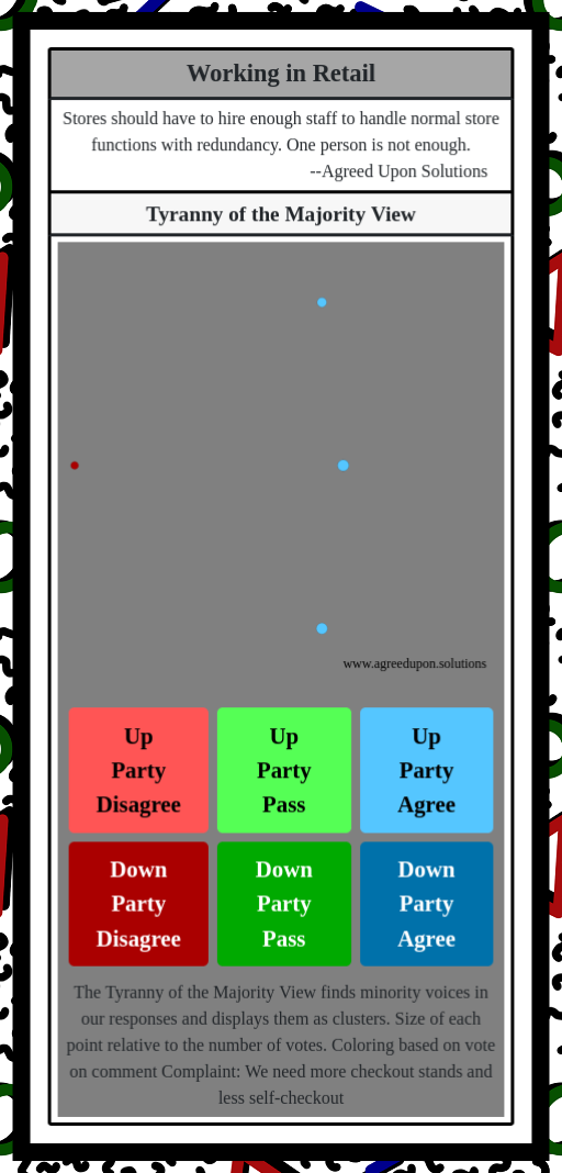 The Tyranny of the Majority View finds minority voices in our responses and displays them as clusters. Size of each point relative to the number of votes. Coloring based on vote on comment