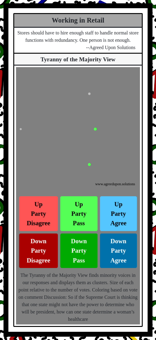 The Tyranny of the Majority View finds minority voices in our responses and displays them as clusters. Size of each point relative to the number of votes. Coloring based on vote on comment