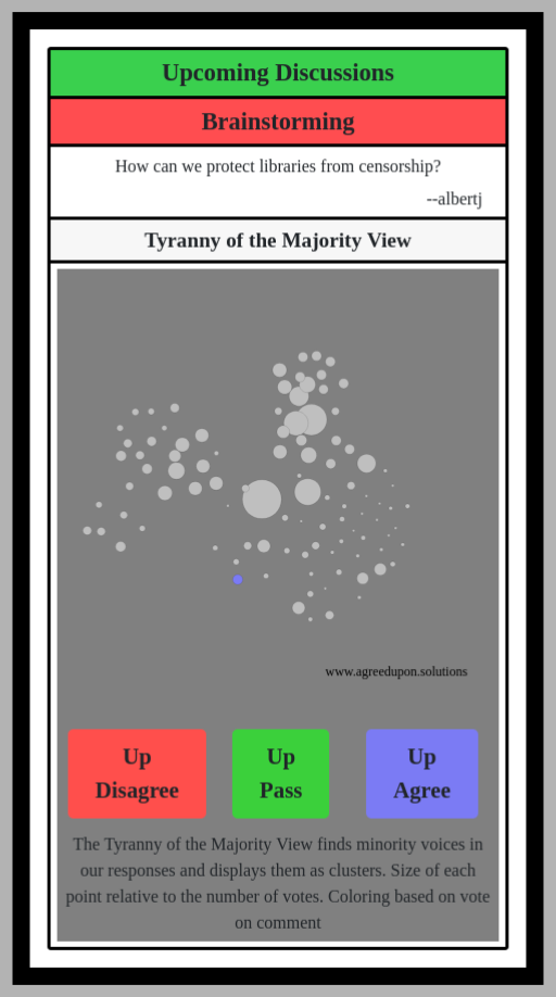 The Tyranny of the Majority View finds minority voices in our responses and displays them as clusters. Size of each point relative to the number of votes. Coloring based on vote on comment