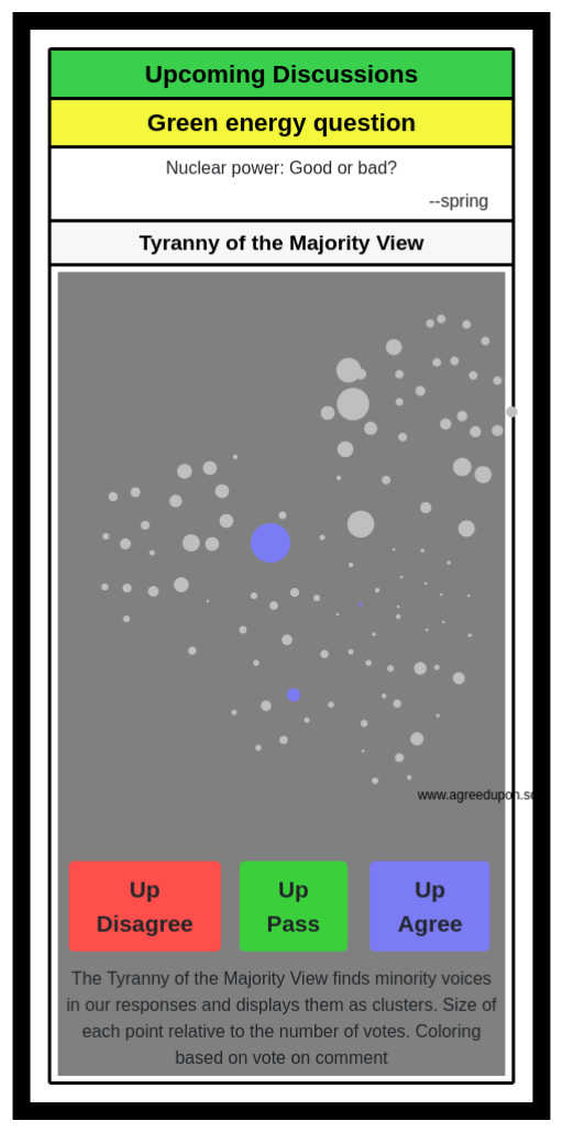 The Tyranny of the Majority View finds minority voices in our responses and displays them as clusters. Size of each point relative to the number of votes. Coloring based on vote on comment