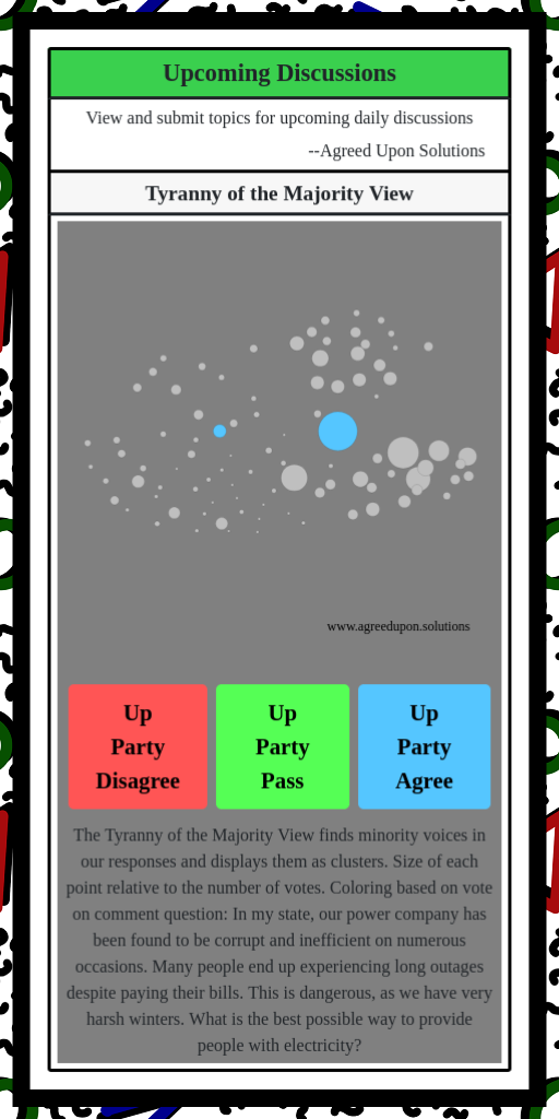 The Tyranny of the Majority View finds minority voices in our responses and displays them as clusters. Size of each point relative to the number of votes. Coloring based on vote on comment