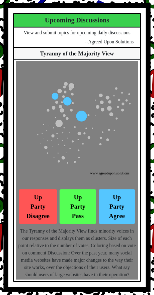 The Tyranny of the Majority View finds minority voices in our responses and displays them as clusters. Size of each point relative to the number of votes. Coloring based on vote on comment
