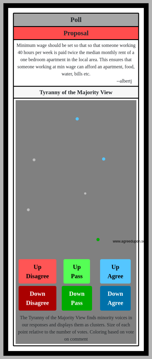 The Tyranny of the Majority View finds minority voices in our responses and displays them as clusters. Size of each point relative to the number of votes. Coloring based on vote on comment
