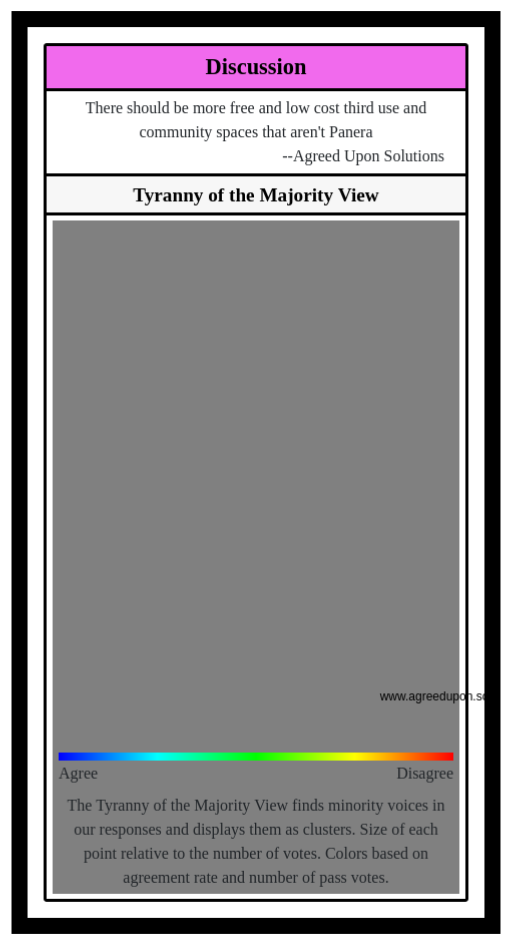 The Tyranny of the Majority View finds minority voices in our responses and displays them as clusters. Size of each point relative to the number of votes. Colors based on agreement rate and number of pass votes.