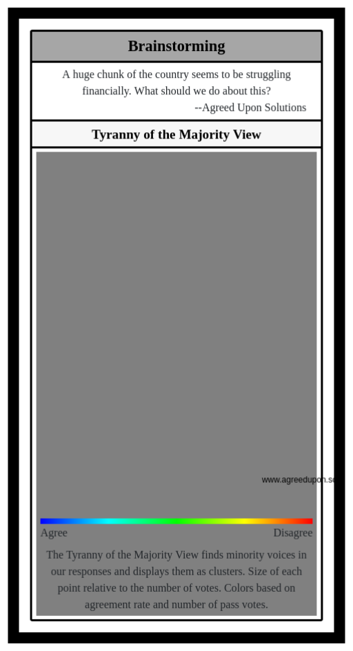 The Tyranny of the Majority View finds minority voices in our responses and displays them as clusters. Size of each point relative to the number of votes. Colors based on agreement rate and number of pass votes.