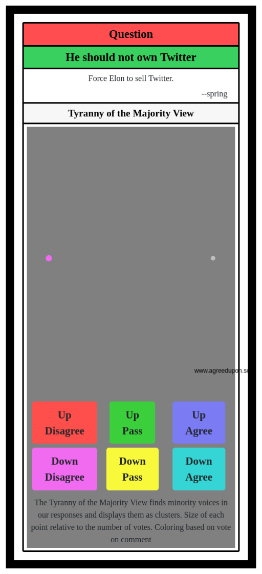 The Tyranny of the Majority View finds minority voices in our responses and displays them as clusters. Size of each point relative to the number of votes. Coloring based on vote on comment