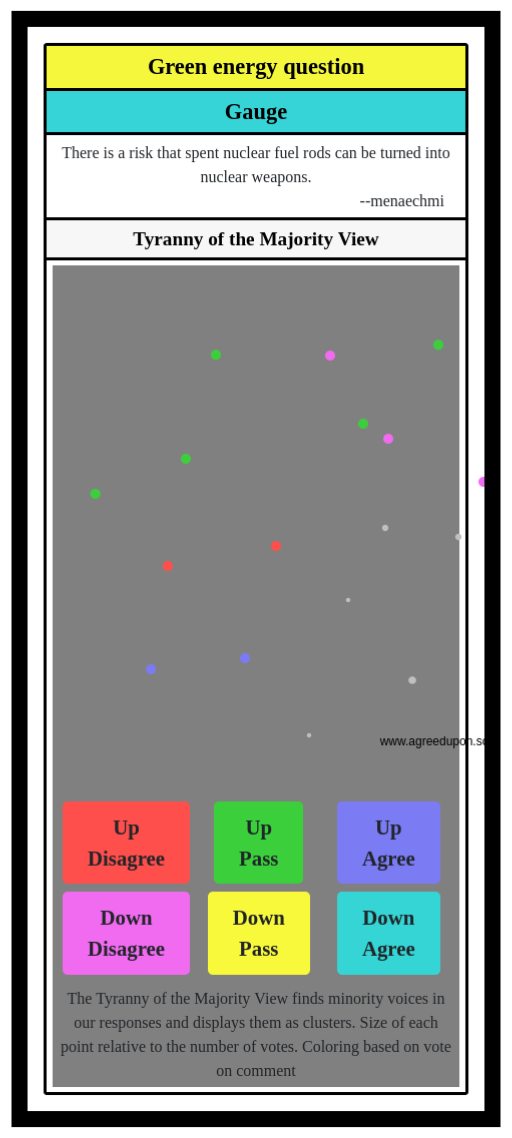 The Tyranny of the Majority View finds minority voices in our responses and displays them as clusters. Size of each point relative to the number of votes. Coloring based on vote on comment