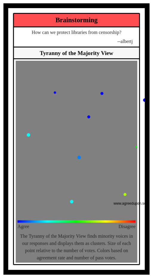 The Tyranny of the Majority View finds minority voices in our responses and displays them as clusters. Size of each point relative to the number of votes. Colors based on agreement rate and number of pass votes.
