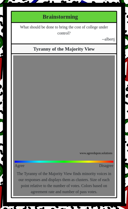 The Tyranny of the Majority View finds minority voices in our responses and displays them as clusters. Size of each point relative to the number of votes. Colors based on agreement rate and number of pass votes.