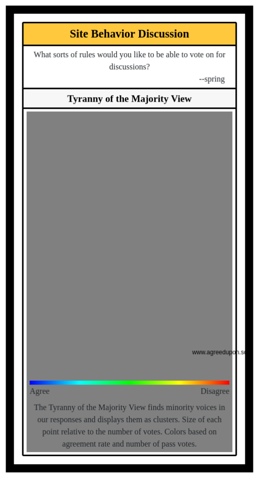 The Tyranny of the Majority View finds minority voices in our responses and displays them as clusters. Size of each point relative to the number of votes. Colors based on agreement rate and number of pass votes.