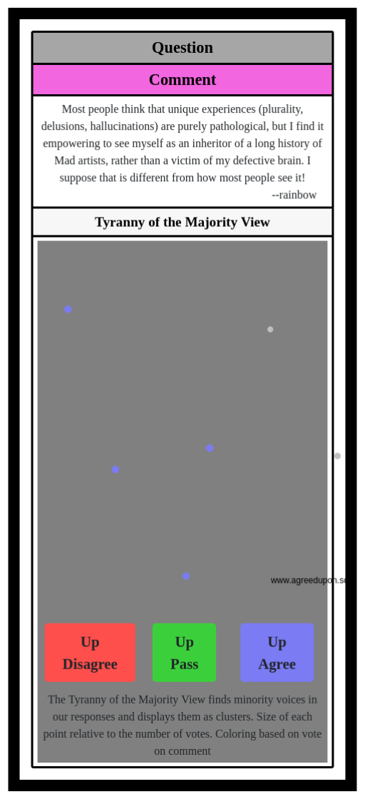 The Tyranny of the Majority View finds minority voices in our responses and displays them as clusters. Size of each point relative to the number of votes. Coloring based on vote on comment