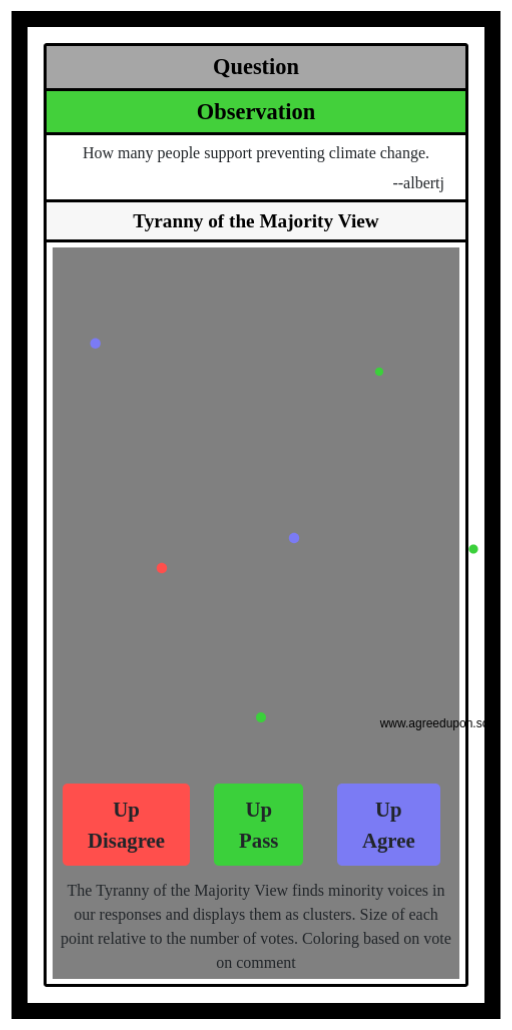 The Tyranny of the Majority View finds minority voices in our responses and displays them as clusters. Size of each point relative to the number of votes. Coloring based on vote on comment