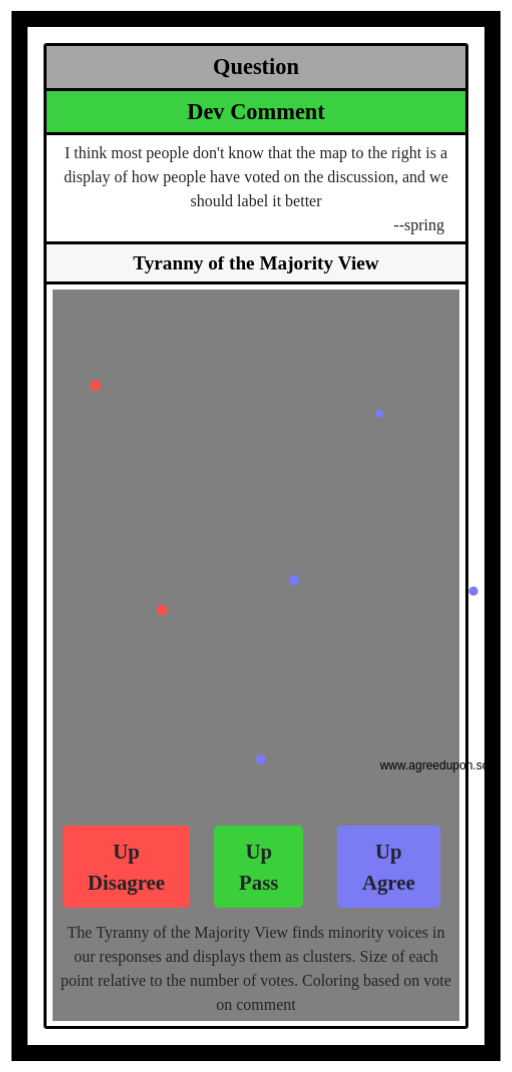 The Tyranny of the Majority View finds minority voices in our responses and displays them as clusters. Size of each point relative to the number of votes. Coloring based on vote on comment