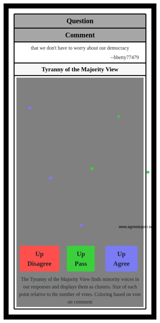 The Tyranny of the Majority View finds minority voices in our responses and displays them as clusters. Size of each point relative to the number of votes. Coloring based on vote on comment