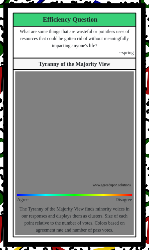 The Tyranny of the Majority View finds minority voices in our responses and displays them as clusters. Size of each point relative to the number of votes. Colors based on agreement rate and number of pass votes.