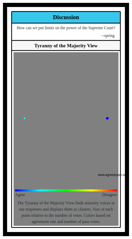 The Tyranny of the Majority View finds minority voices in our responses and displays them as clusters. Size of each point relative to the number of votes. Colors based on agreement rate and number of pass votes.