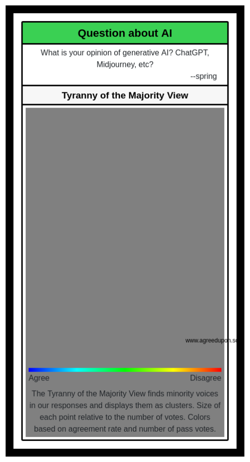 The Tyranny of the Majority View finds minority voices in our responses and displays them as clusters. Size of each point relative to the number of votes. Colors based on agreement rate and number of pass votes.