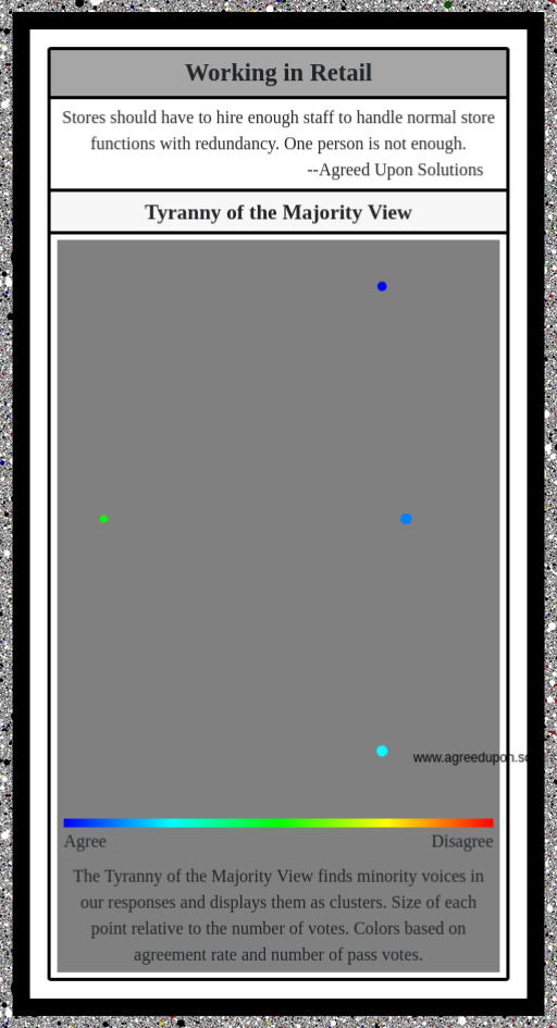 The Tyranny of the Majority View finds minority voices in our responses and displays them as clusters. Size of each point relative to the number of votes. Colors based on agreement rate and number of pass votes.