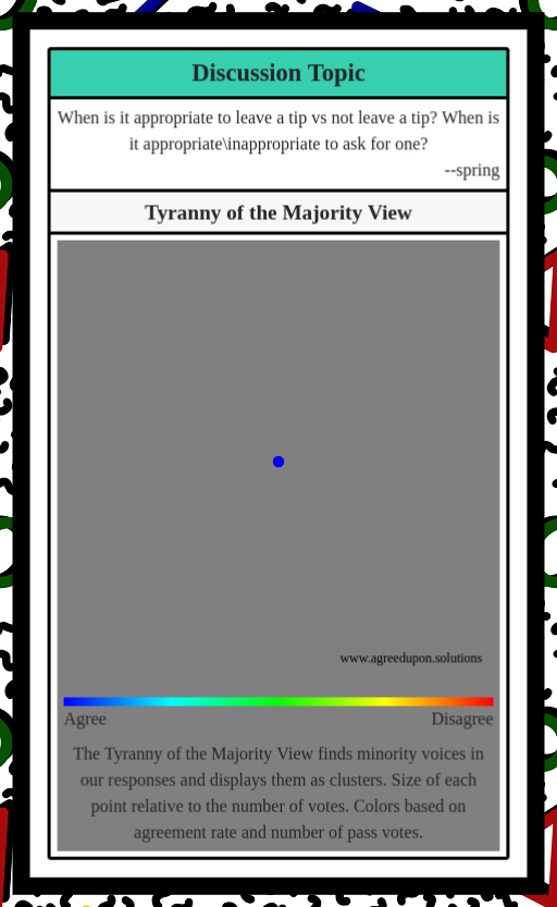 The Tyranny of the Majority View finds minority voices in our responses and displays them as clusters. Size of each point relative to the number of votes. Colors based on agreement rate and number of pass votes.