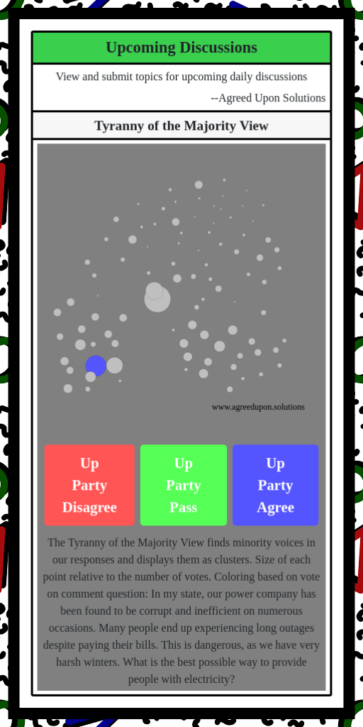 The Tyranny of the Majority View finds minority voices in our responses and displays them as clusters. Size of each point relative to the number of votes. Coloring based on vote on comment