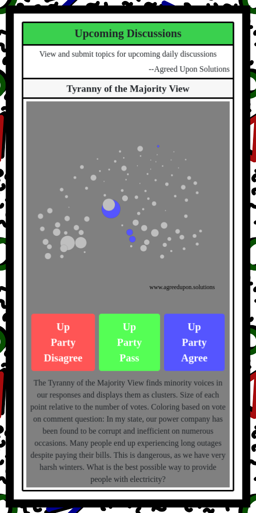 The Tyranny of the Majority View finds minority voices in our responses and displays them as clusters. Size of each point relative to the number of votes. Coloring based on vote on comment