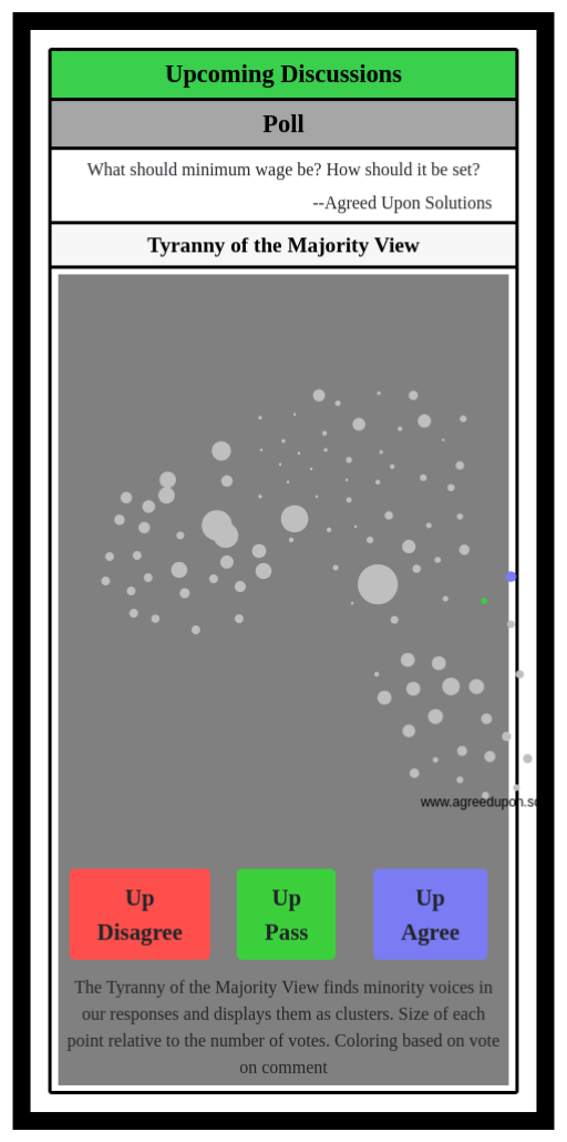 The Tyranny of the Majority View finds minority voices in our responses and displays them as clusters. Size of each point relative to the number of votes. Coloring based on vote on comment