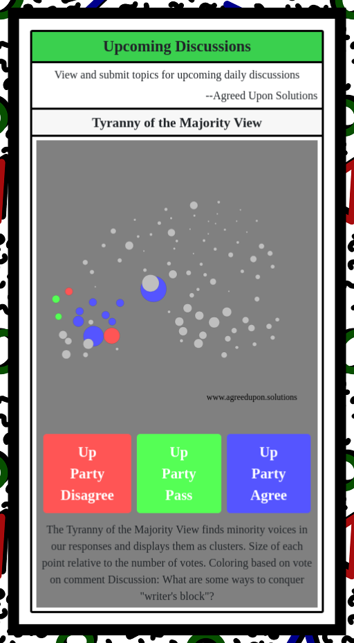 The Tyranny of the Majority View finds minority voices in our responses and displays them as clusters. Size of each point relative to the number of votes. Coloring based on vote on comment