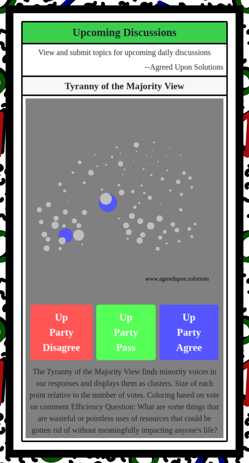 The Tyranny of the Majority View finds minority voices in our responses and displays them as clusters. Size of each point relative to the number of votes. Coloring based on vote on comment