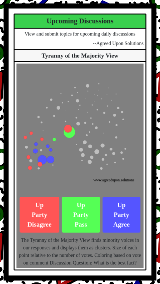 The Tyranny of the Majority View finds minority voices in our responses and displays them as clusters. Size of each point relative to the number of votes. Coloring based on vote on comment