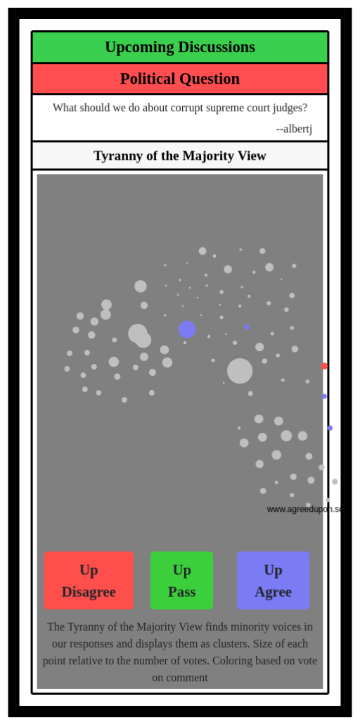 The Tyranny of the Majority View finds minority voices in our responses and displays them as clusters. Size of each point relative to the number of votes. Coloring based on vote on comment