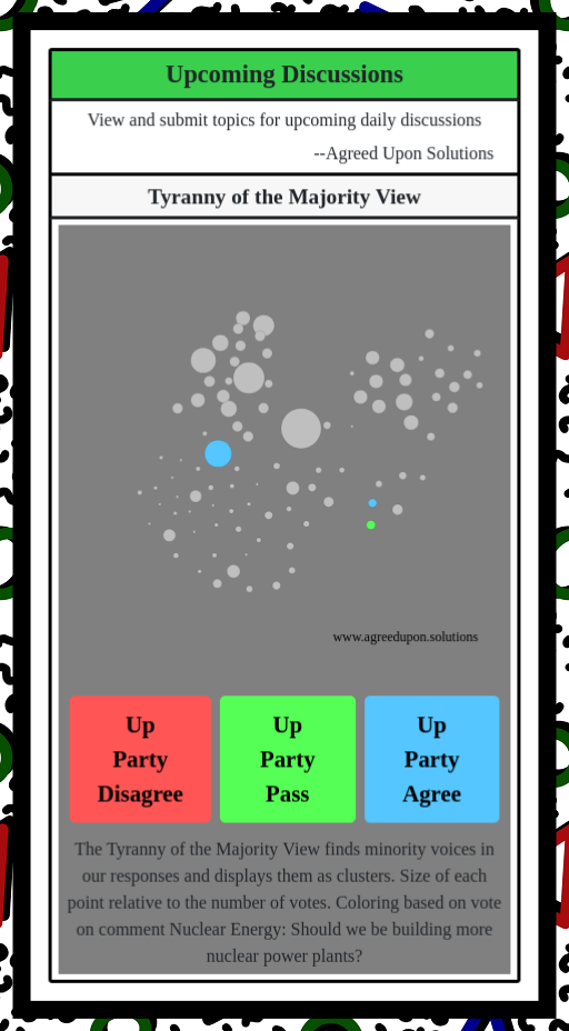 The Tyranny of the Majority View finds minority voices in our responses and displays them as clusters. Size of each point relative to the number of votes. Coloring based on vote on comment