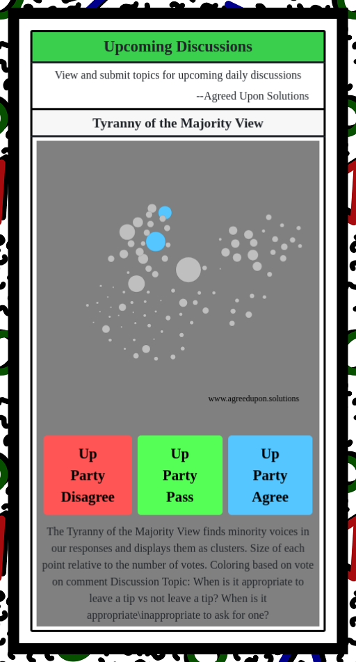 The Tyranny of the Majority View finds minority voices in our responses and displays them as clusters. Size of each point relative to the number of votes. Coloring based on vote on comment