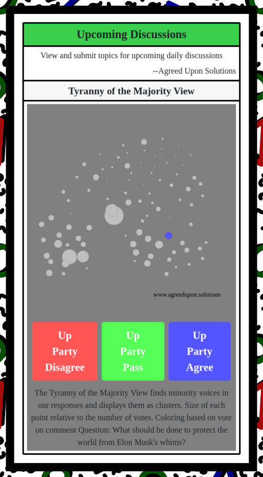 The Tyranny of the Majority View finds minority voices in our responses and displays them as clusters. Size of each point relative to the number of votes. Coloring based on vote on comment