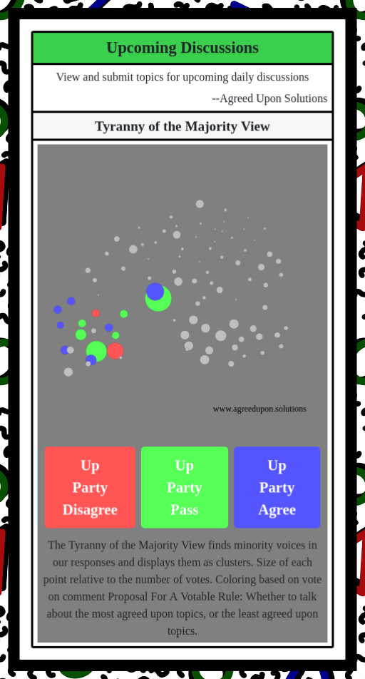 The Tyranny of the Majority View finds minority voices in our responses and displays them as clusters. Size of each point relative to the number of votes. Coloring based on vote on comment