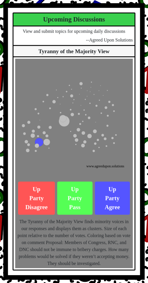 The Tyranny of the Majority View finds minority voices in our responses and displays them as clusters. Size of each point relative to the number of votes. Coloring based on vote on comment