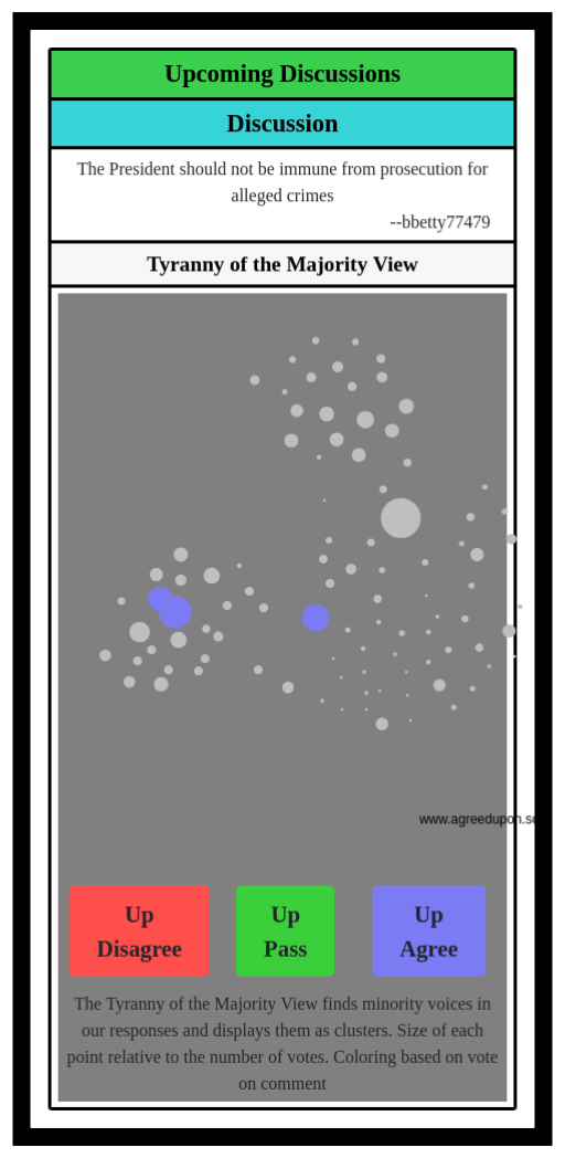 The Tyranny of the Majority View finds minority voices in our responses and displays them as clusters. Size of each point relative to the number of votes. Coloring based on vote on comment