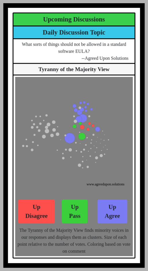 The Tyranny of the Majority View finds minority voices in our responses and displays them as clusters. Size of each point relative to the number of votes. Coloring based on vote on comment