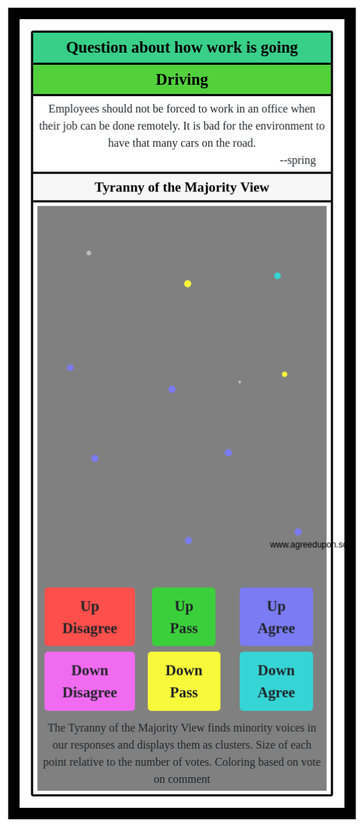 The Tyranny of the Majority View finds minority voices in our responses and displays them as clusters. Size of each point relative to the number of votes. Coloring based on vote on comment
