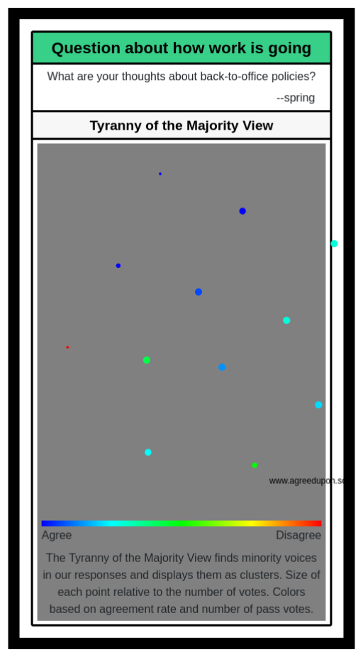 The Tyranny of the Majority View finds minority voices in our responses and displays them as clusters. Size of each point relative to the number of votes. Colors based on agreement rate and number of pass votes.
