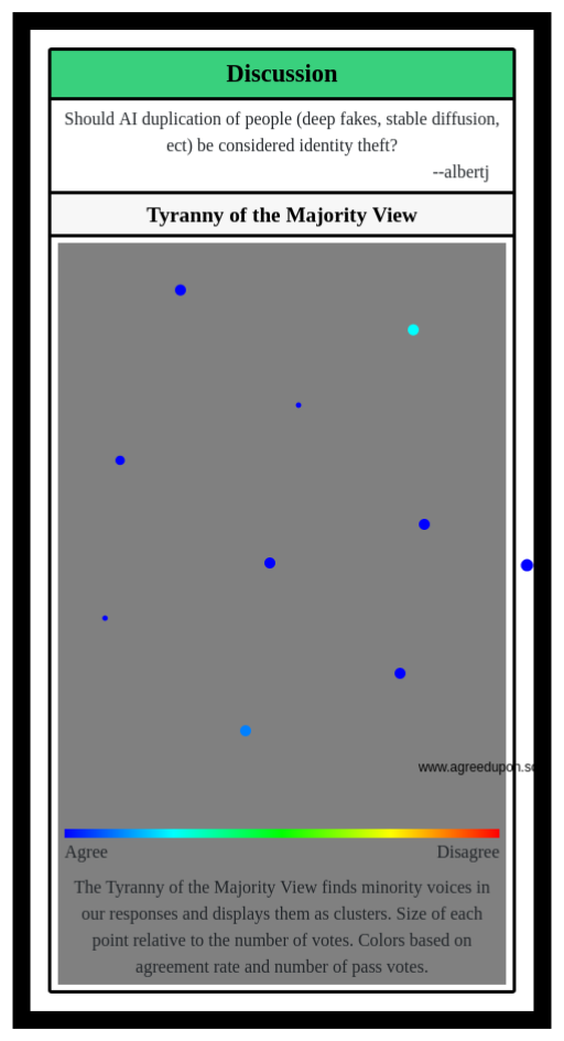 The Tyranny of the Majority View finds minority voices in our responses and displays them as clusters. Size of each point relative to the number of votes. Colors based on agreement rate and number of pass votes.