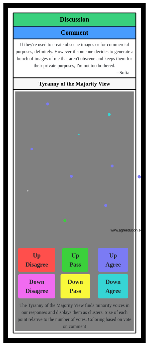 The Tyranny of the Majority View finds minority voices in our responses and displays them as clusters. Size of each point relative to the number of votes. Coloring based on vote on comment