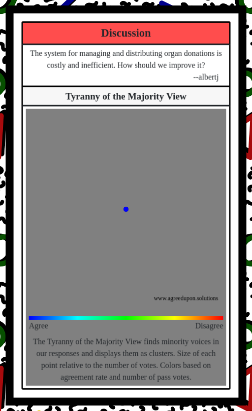 The Tyranny of the Majority View finds minority voices in our responses and displays them as clusters. Size of each point relative to the number of votes. Colors based on agreement rate and number of pass votes.