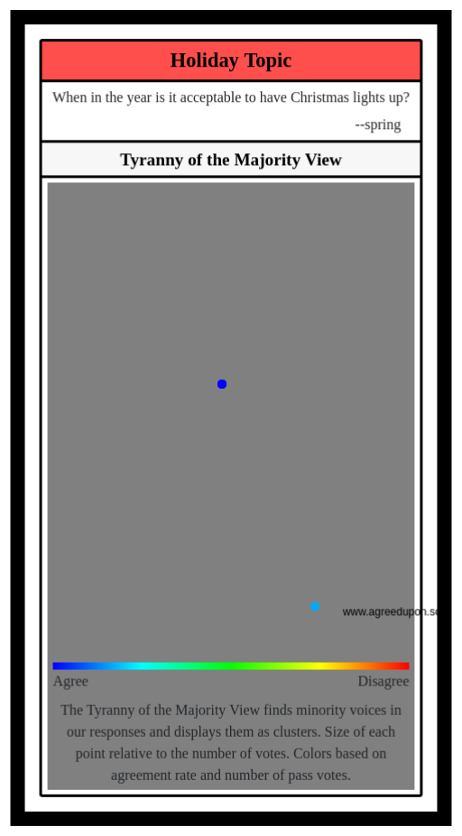 The Tyranny of the Majority View finds minority voices in our responses and displays them as clusters. Size of each point relative to the number of votes. Colors based on agreement rate and number of pass votes.