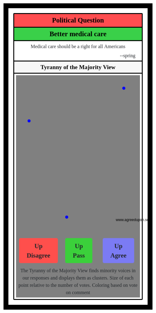 The Tyranny of the Majority View finds minority voices in our responses and displays them as clusters. Size of each point relative to the number of votes. Coloring based on vote on comment