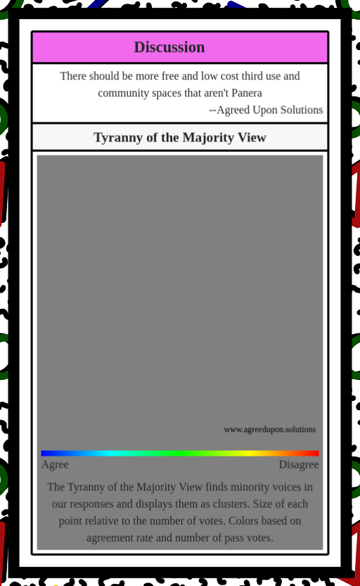 The Tyranny of the Majority View finds minority voices in our responses and displays them as clusters. Size of each point relative to the number of votes. Colors based on agreement rate and number of pass votes.