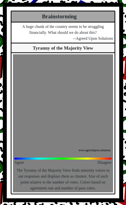 The Tyranny of the Majority View finds minority voices in our responses and displays them as clusters. Size of each point relative to the number of votes. Colors based on agreement rate and number of pass votes.
