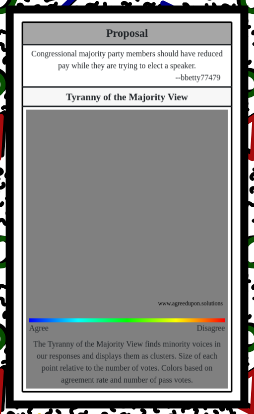 The Tyranny of the Majority View finds minority voices in our responses and displays them as clusters. Size of each point relative to the number of votes. Coloring based on vote on comment