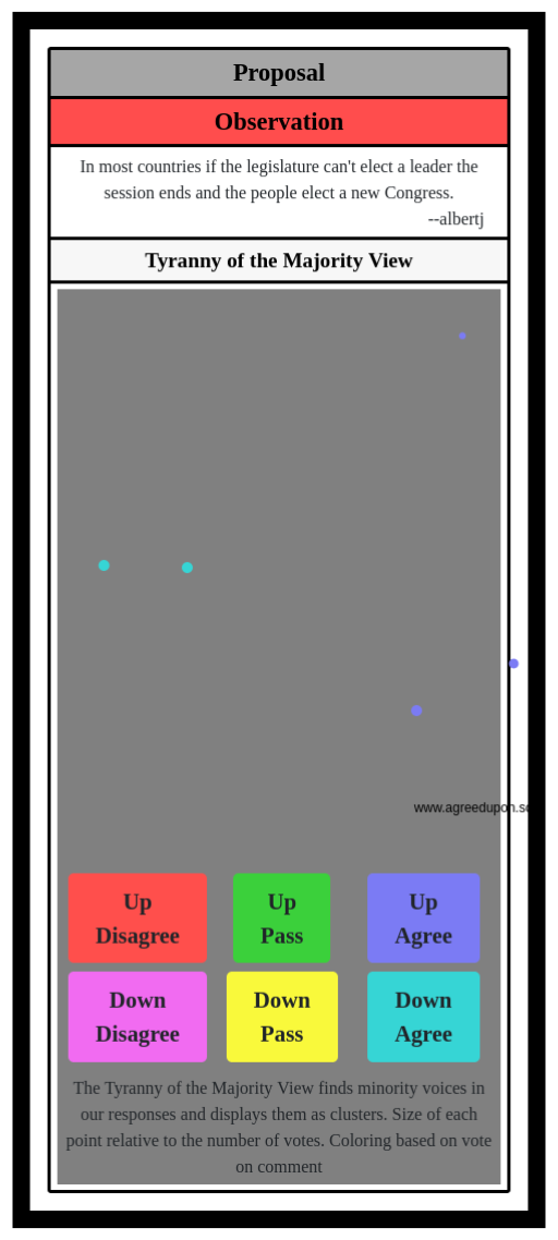 The Tyranny of the Majority View finds minority voices in our responses and displays them as clusters. Size of each point relative to the number of votes. Coloring based on vote on comment