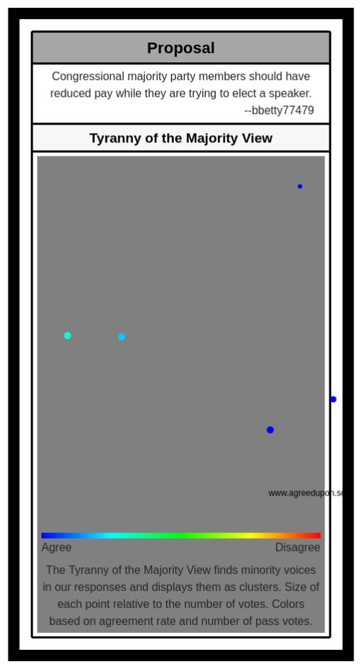 The Tyranny of the Majority View finds minority voices in our responses and displays them as clusters. Size of each point relative to the number of votes. Colors based on agreement rate and number of pass votes.